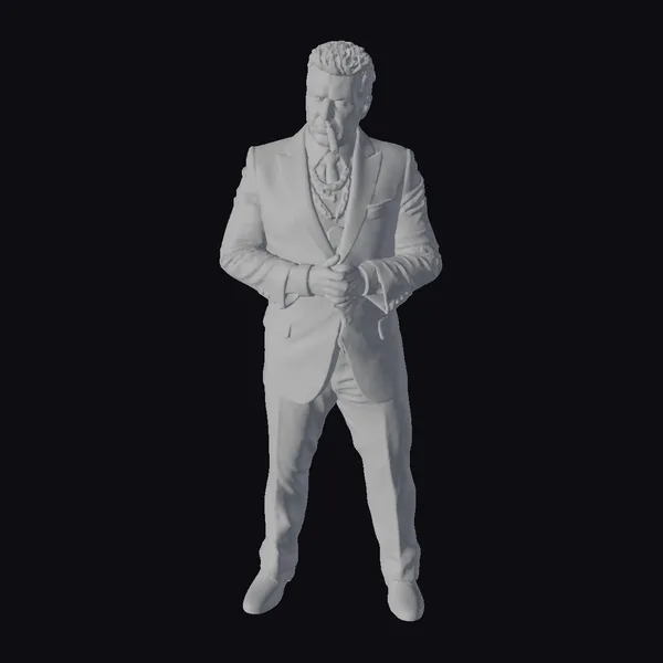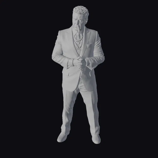 Standing tall with a formidable, barrel-chested physique, this character makes a statement with his bold, emerald green suit. The custom-tailored ensemble showcases a meticulous attention to detail, from the gold-striped silk fabric to the perfectly coordinated emerald green vest and tie. The character’s dark hair is styled to perfection, complementing his sharp features and intense gaze. A cigarette is poised between his fingers, adding a hint of ruggedness to his otherwise polished demeanor. This 3D model is perfect for projects that require a character with a strong, authoritative presence, such as animations, games, or architectural visualizations. Its stylized, cartoonish style allows for a wide range of creative applications, from humorous to dramatic.