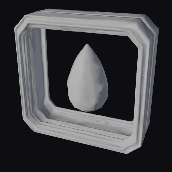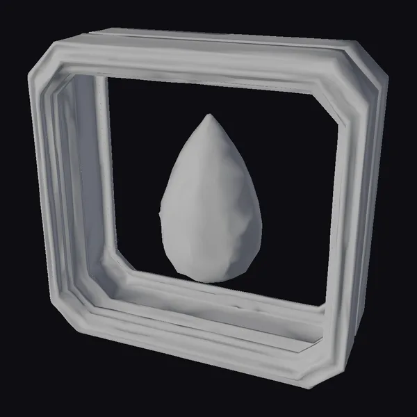 Positioned centrally within a sleek, green frame, the teardrop-shaped emerald is a marvel of digital craftsmanship. Its facets reflect light, giving it a lifelike appearance. The frame, with its clean lines and geometric precision, complements the organic shape of the gemstone beautifully. This model is ideal for use in digital art projects, virtual reality experiences, 3D printing, and as a unique NFT card. Its high level of detail and realistic textures make it suitable for animation and game design applications.