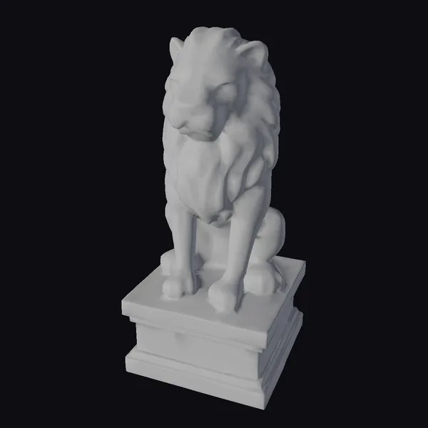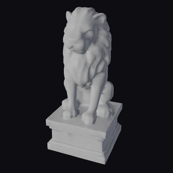 The emerald green lion statue sits poised on a square pedestal, its body language conveying a sense of calm strength. The statue’s mane and fur are meticulously detailed, with each strand and texture carefully rendered to create a lifelike appearance. The lion’s facial expression is tranquil, with a subtle hint of a gaze that seems to engage the viewer. The pedestal, adorned with simple molding, complements the statue without detracting from the lion’s majesty. This model is perfect for use in games, 3D printing, VR/AR experiences, animation, and design projects, offering a versatile and visually striking element. Its high level of detail, especially in the lion’s face and fur, makes it suitable for projects requiring realism.