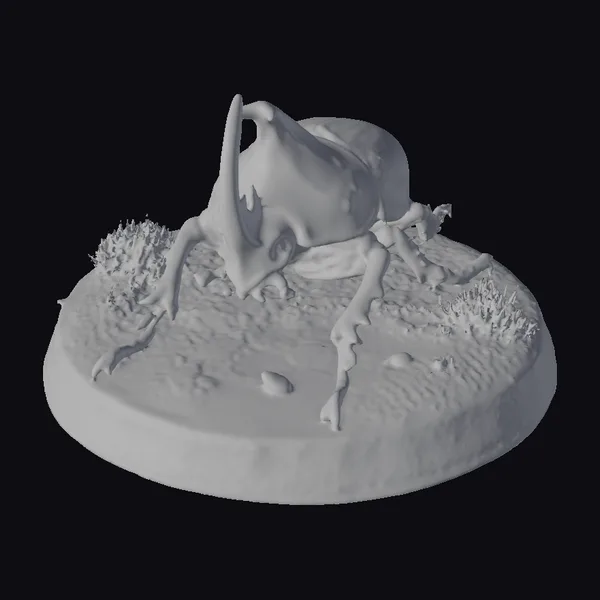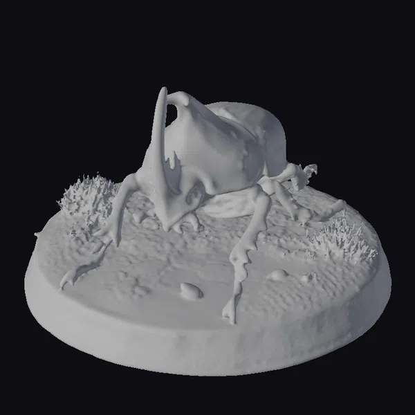 In a dynamic pose, this stylized emerald scarab beetle dominates its circular base, crafted to resemble cracked, arid earth. The beetle’s body is a mesmerizing blend of green and blue hues, reflecting light and seeming to shift colors as it moves. Its distinctive curved horn and spiked legs are rendered in sharp detail, lending an air of ferocity to its stance. The base itself is adorned with small clumps of grass, providing a contrast between the harsh, dry ground and the vibrant life of the beetle. Ideal for use in games, 3D printing, VR/AR experiences, animation, and design projects, this model brings a touch of fantasy and mystique to any project.