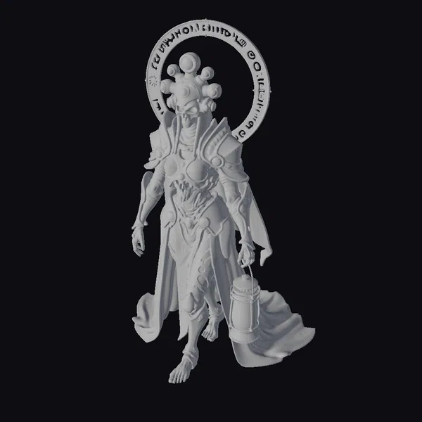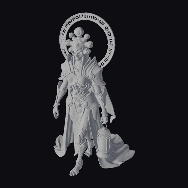 This eerie yet mesmerizing skeletal figure is captured in a dynamic pose, its emerald-green glowing eyes and lantern a stark contrast to the stark white of its bones. The intricate details of its armor, adorned with mysterious runes, suggest a guardian of ancient, forbidden knowledge. The skeletal warrior’s cape flows dramatically behind it, as if moving in an unseen breeze. The lantern it holds not only illuminates its face but also seems to pulse with a life of its own, casting an emerald glow across the surrounding space. This model is perfect for adding a touch of mysticism and eerie elegance to games, animations, or virtual reality experiences.