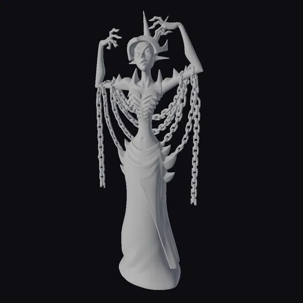 Standing tall with an air of mystique, this emerald green figure is meticulously detailed with spikes adorning her body and a serene yet unsettling expression on her face. Chains drape dramatically from her raised arms, adding a dynamic element to her static pose. The model’s gothic-inspired design, complete with intricate textures and a metallic sheen, makes it a compelling addition to any fantasy or dark-themed project. Ideal for use in games, 3D printing, VR/AR experiences, or animation projects, this figure brings a touch of the mysterious and unknown.