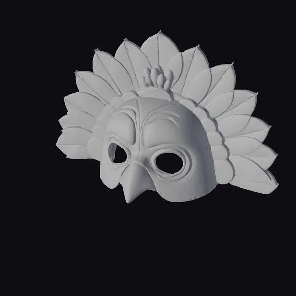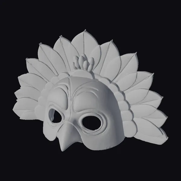 Crafted with meticulous attention to detail, this stylized turkey mask boasts a smooth, white finish with a distinctive textured beak and expressive facial features. The eye holes are carefully shaped for a playful appearance, while the crown of the mask is adorned with a beautiful arrangement of shiny feathers, adding a touch of elegance. Ideal for use in games, 3D printing projects, VR/AR experiences, animations, or designs looking for a festive and quirky element. The mask’s unique design and high-quality details make it a standout prop for any creative project.