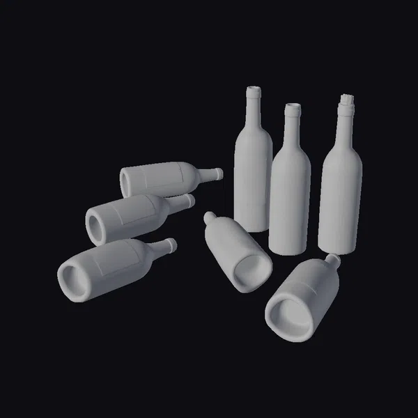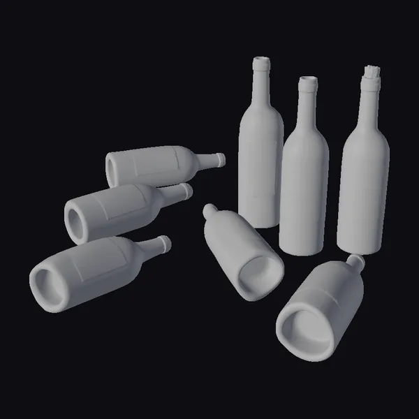 This arrangement of empty wine bottles showcases a mix of standing and fallen bottles, each with detailed labels and a realistic glass texture. The bottles vary in their positioning, with some lying on their sides and others standing upright, creating a dynamic and cluttered scene. The labels on the bottles add a touch of authenticity, making this 3D model perfect for adding a realistic touch to games, animations, or architectural visualizations. The detailed textures and varied poses of the bottles make this model suitable for close-up shots or scenes where a sense of realism is crucial.
