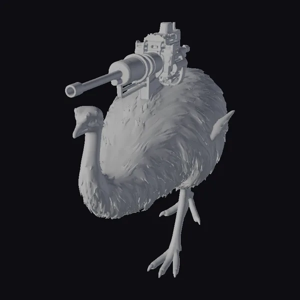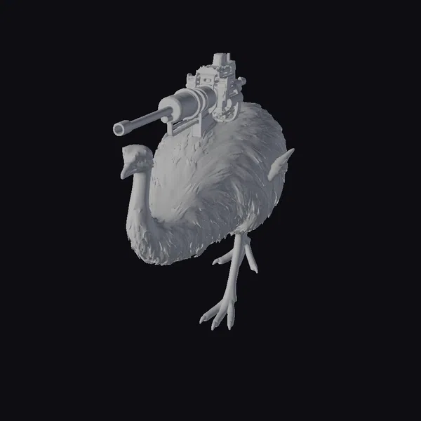 The Model “Emu with Machine Gun” is also available upon request in many other 3D formats, such as 3MF, BLEND, FBX, OBJ, USDZ and others, making it easy to integrate into your project.