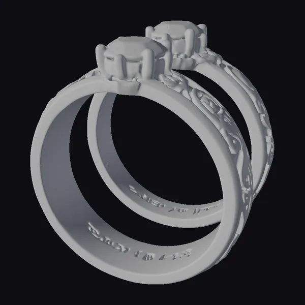 In a mesmerizing display of intricate craftsmanship, these enchanted couple rings intertwine, exuding an aura of mysticism. The silver ring, set with a small, vibrant ruby, seems to shimmer with an ethereal light, as if the very essence of the gemstone has been distilled into its metal. Its counterpart, bathed in the warm tones of rose gold, complements the duo with an equally captivating glow. The runes engraved along their edges appear to pulse with a soft, magical energy, inviting the beholder to ponder the secrets they might hold. These rings are perfect for those who seek to add a touch of fantasy to their digital creations, be it in games, 3D printing, VR/AR experiences, animation, or design projects.