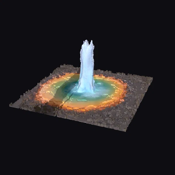 In a mesmerizing display of natural power, a geothermal geyser shoots water high into the air, its plume a frothy white that contrasts sharply with the vibrant hues of the pool below. The pool itself is a kaleidoscope of colors, gradating from deep blues and greens at the center to warm yellows and oranges towards the edges, where the water meets the rocky terrain. The terrain, rough and unyielding, frames the pool and geyser, adding a sense of ruggedness to the scene. This 3D model captures the dynamic movement and stunning beauty of a geothermal eruption, making it perfect for use in games, animations, virtual reality experiences, and architectural visualizations where a touch of natural wonder is desired.