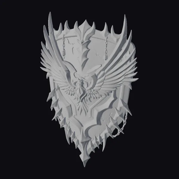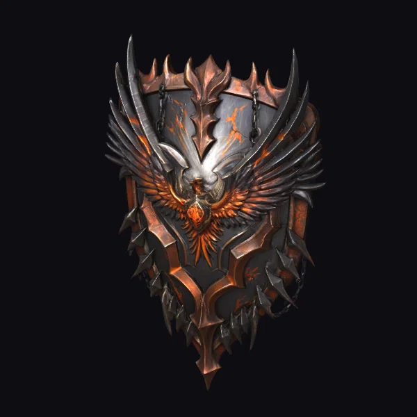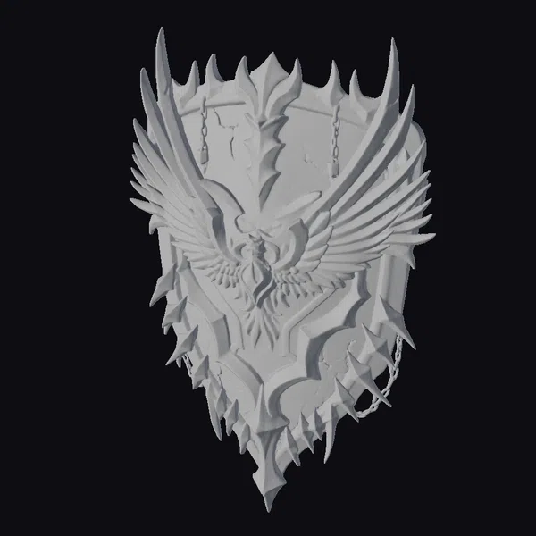 This intricately designed shield features a phoenix in mid-flight, its wings spread wide with fiery plumage that seems to dance in the light. The shield itself is a masterwork of dark, metallic craftsmanship, adorned with spikes and chains that add to its formidable appearance. The phoenix, a symbol of rebirth and immortality, is rendered in exquisite detail, with textures that suggest both metal and flame. Ideal for use in games, animation, or design projects, this model brings a touch of fantasy and mythology to any scene. Its high level of detail and realistic textures make it suitable for close-up shots or as a central element in a composition.