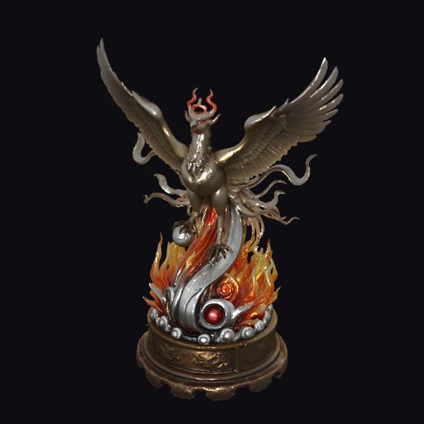 In a majestic pose, the Eternal Phoenix Serenity rises from a base engulfed in vibrant, orange and yellow flames, its bronze body radiating a sense of peaceful power. The phoenix’s wings, outstretched and strong, appear poised for ascent, while its eyes seem to hold a deep, inner wisdom. A delicate, fiery crown rests upon its head, adding a touch of mysticism to its already awe-inspiring presence. The base, adorned with a red gemstone and intricate details, adds to the overall sense of luxury and wonder. This stunning model is perfect for use in games, 3D printing, VR/AR experiences, animation, and design projects, where a touch of mythical elegance is desired.