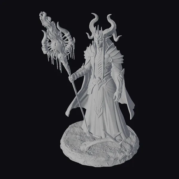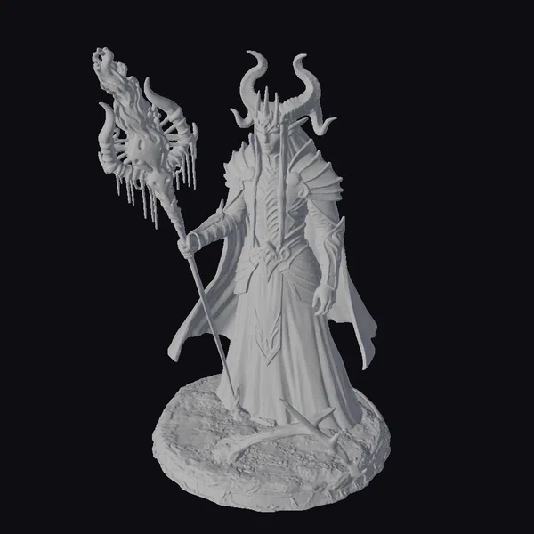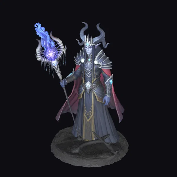 Standing imposingly on a dark base, the sorcerer’s intricate armor is a marvel of detailed design, complete with a chest plate, shoulder guards, and a helmet featuring curved horns. A rich, red cape flows behind him, contrasting with the dark tones of his attire. His staff, a conduit of blue and purple magic, adds to the mystique of this powerful figure. The sorcerer’s pale skin and the glowing blue light on his forehead enhance his mystical aura. This model is perfect for use in games, 3D printing, VR/AR experiences, animation, and design projects, offering a rich source of inspiration for creators.