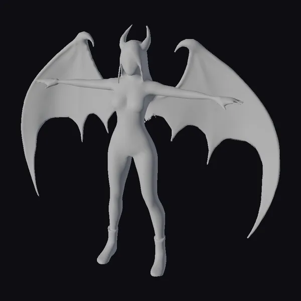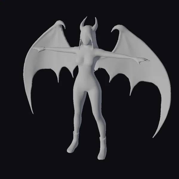 Detailed from head to toe, this figurine showcases a female demon with a perfect blend of terrifying and alluring features. Her long black hair flows down her back as she stands confidently, arms outstretched with large, purple-tinted bat wings spread wide. The black bodysuit and boots are sleek and form-fitting, accentuating her physique, while red horns atop her head add a pop of color. The realistic style shines through in her facial features, skin texture, and the intricate details of her wings and attire. Ideal for use in games, 3D printing, VR/AR experiences, animation, and design projects, this model brings a touch of dark fantasy to any project.