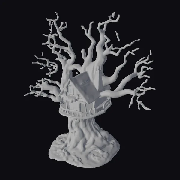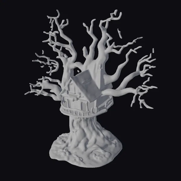 Deep within a mystical forest, a gnarled tree stretches towards the sky, its twisted branches like skeletal fingers. The treehouse, nestled within the crook of a branch, appears to grow organically from the tree itself. The wooden boards are weathered to a silvery gray, with hints of moss and lichen clinging to the base. A steeply pitched roof, shingled in worn brown wood, seems to sag under the weight of secrets. Crooked windows, like empty eyes, stare out into the darkness. This 3D model is perfect for adding a touch of dark fantasy to games, animations, or architectural designs.