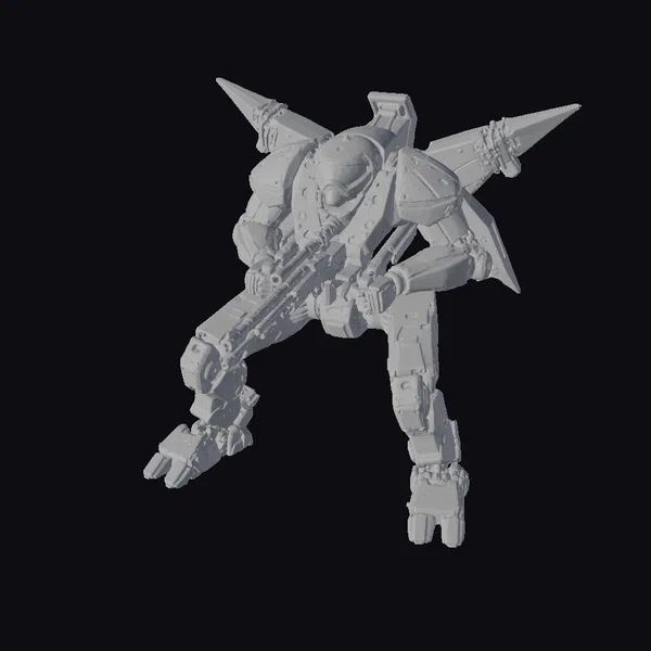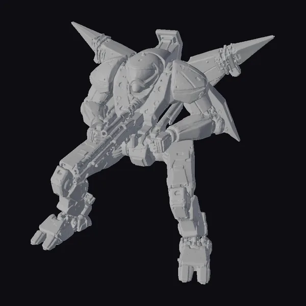 Crafted with meticulous attention to detail, this exoskeleton war machine model showcases a humanoid robot clad in heavy, metallic armor with a predominantly gray and black color scheme. Its pose suggests dynamic movement, with the left leg forward and arms extended to hold a large rifle. The back of the exoskeleton features a distinctive star-shaped structure with sharp, pointed protrusions and what appears to be a canopy for the pilot. Equipped with a missile launcher on its back and a blaster rifle in hand, this model radiates a sense of formidable power. The exoskeleton’s design includes rockets for propulsion and flight, highlighting its advanced capabilities. Ideal for use in sci-fi games, animations, or as a design reference for futuristic projects, this model brings a touch of high-tech warfare to any creative endeavor.