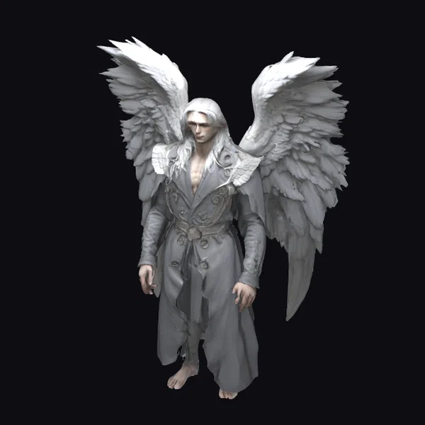 In a pose that seems both powerful and forlorn, this ultra-detailed 3D model of a fallen angel captures the essence of mythological elegance with a dark twist. The figure’s long, white hair cascades down his chest, framing a face that reflects a deep sense of loss. His wings, a marvel of detailed craftsmanship, sprawl out behind him in shades of white and gray, suggesting a being caught between heaven and earth. The model’s attire, a sophisticated ensemble of gray garments with a belted coat, adds a layer of complexity to his character, suggesting a story of fall from grace. The bare feet and exposed chest add a touch of vulnerability to his otherwise majestic appearance. This model is perfect for projects requiring a character with a rich narrative potential, such as animations, games, or virtual reality experiences.