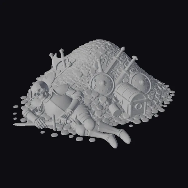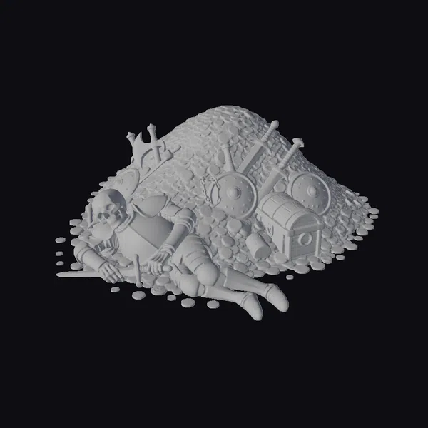 Deep within a mountain of glittering gold coins, a lone knight lies motionless, his skeletal frame a testament to the transience of power. His once-majestic armor now tarnished and battered, the knight’s skull stares blankly into the void, a crown lying broken beside him. Swords, shields, and chests overflow from the treasure pile, as if the very riches themselves have consumed him. The intricate textures of the armor, the roughness of the coins, and the detailed weathering of the metal all come together to create a hauntingly beautiful scene. Ideal for use in games, animations, or 3D prints, this model invites you to explore the darker side of fantasy and the allure of treasure.