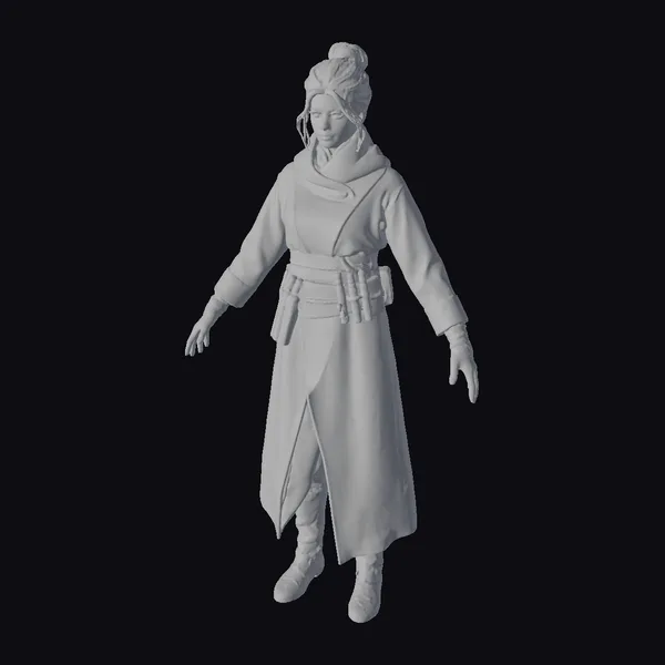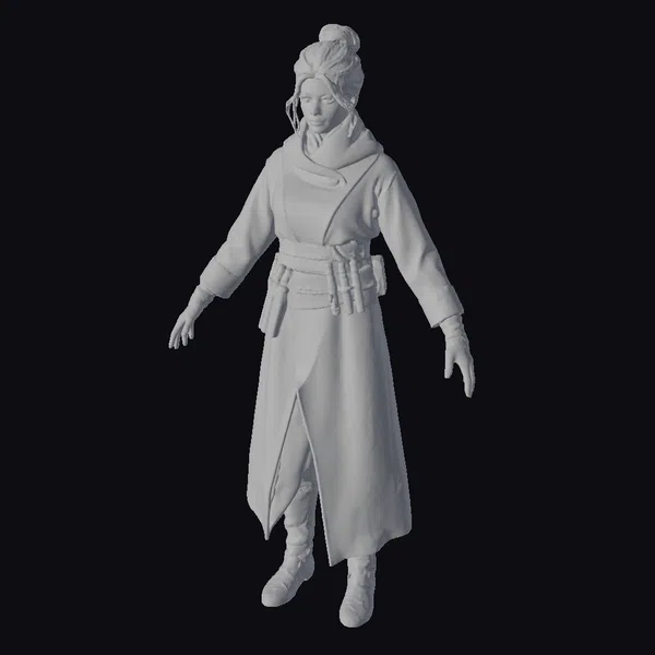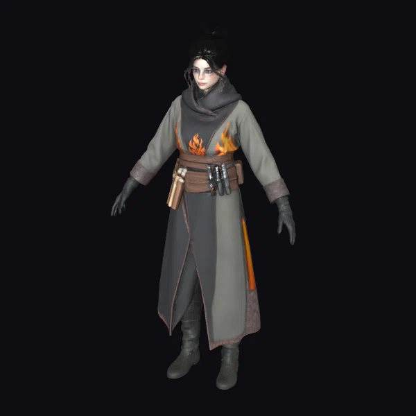 Detailed with precision, this 3D model showcases a female warrior in a dynamic stance, her body angled slightly to the left. She wears a long, gray coat with dark trim and orange flame designs on the chest and side, paired with a dark outfit underneath. A brown leather belt encircles her waist, holding a holstered pistol and additional ammunition. Her dark hair is pulled into a neat bun atop her head, and she dons black gloves and boots. The model’s facial features are finely tuned, exuding a sense of readiness and strength. The intricate details make it suitable for various applications, including games, 3D printing, VR/AR experiences, animation, and design projects.
