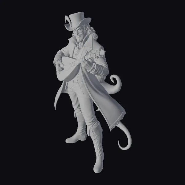 This highly detailed 3D model captures a fantasy demon engrossed in playing the lute, showcasing a richly textured and colored character. The demon is adorned in a striking red and purple coat with gold accents, paired with a black top hat and boots. Its red skin and curled tail add to its mythical allure. The lute, with its earthy tones, complements the demon’s vibrant attire. The model’s intricate details make it perfect for use in games, animations, or virtual reality experiences, offering a unique character to enhance any fantasy setting.