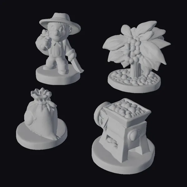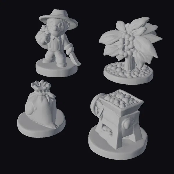 Imagine strolling through a serene countryside setting, surrounded by the fruits of labor. This set of four figurines showcases a farmer proudly holding a tool and a sack of produce, standing alongside a thriving plant bursting with fruits or flowers. A burlap sack filled with goods and a thresher filled with harvested crops complete the scene. Crafted in a stylized, cartoonish style, these models feature smooth textures and a uniform beige color, perfect for adding a touch of rustic whimsy to any 3D environment. Ideal for use in games, animations, or architectural visualizations where a rural feel is desired.