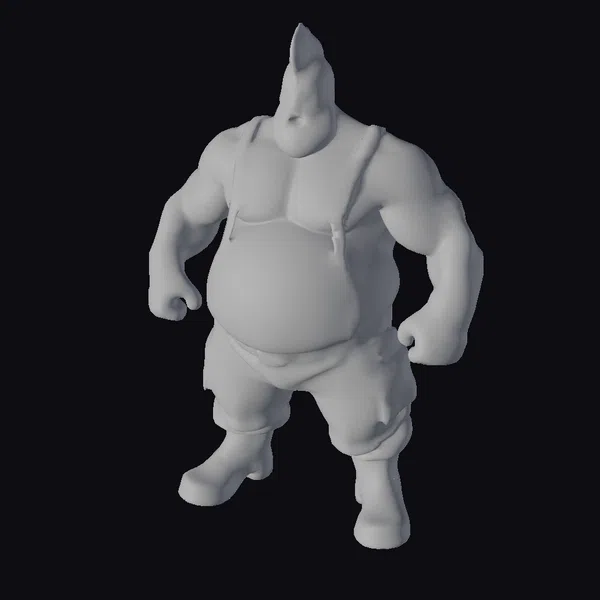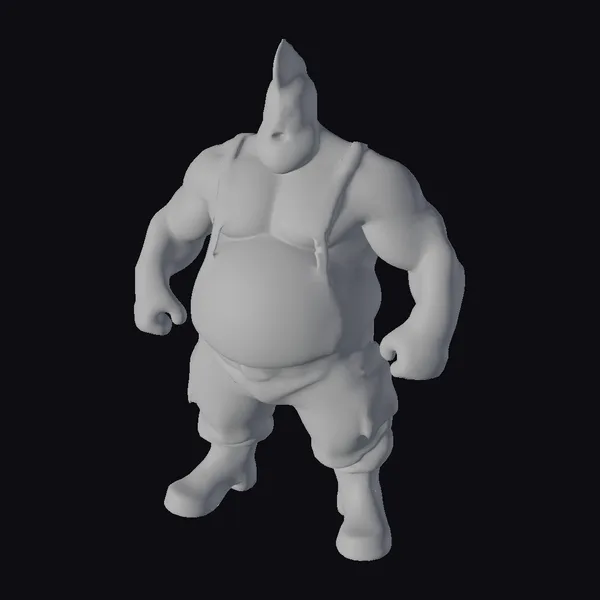 Standing with a wide stance, this cartoon-style character model showcases intricate details such as the texture of his skin, the shading of his cargo pants, and the sheen on his boots. His angry expression and open mouth add to his intimidating demeanor. The model is highly detailed, with a focus on realistic proportions and anatomy, making it suitable for various applications including games, animation, and 3D printing. The character’s design, featuring a prominent belly, muscular arms, and a fauxhawk, suggests a versatile use in storytelling and visual projects.