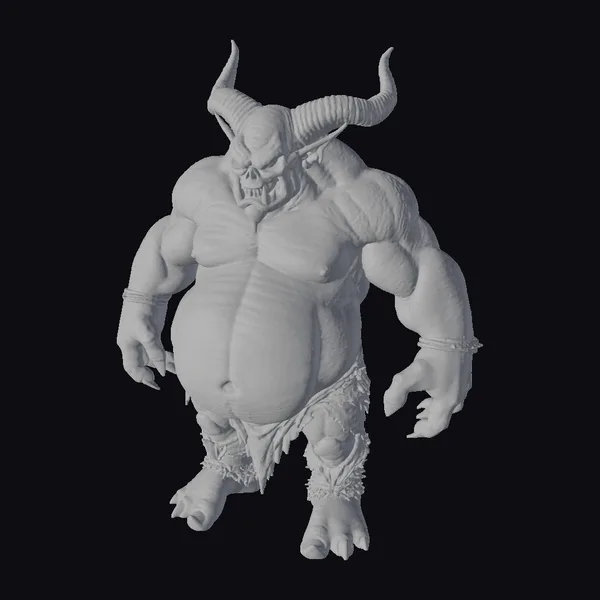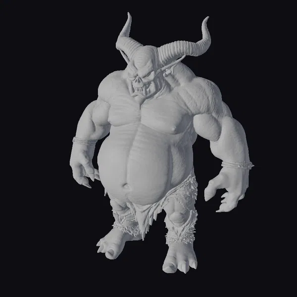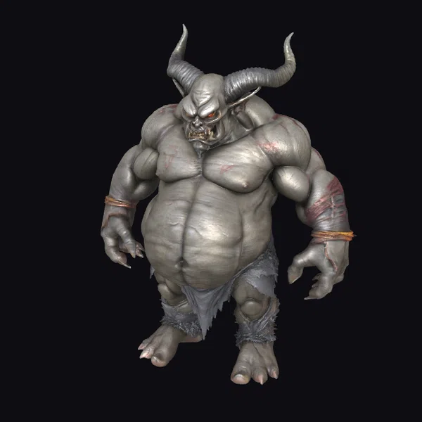 Standing tall with a formidable stance, this fat wobbly orc demon model showcases intricate details such as bulging muscles, sharp claws, and a pair of imposing horns that curve back from its forehead. The skin is a mix of gray tones with visible red markings, suggesting a life of battle and brutality. The eyes glow red, adding to the menacing look. The model is adorned with tattered cloth around its waist and bound wrists, hinting at a backstory of captivity or punishment. This model is perfect for projects requiring a fearsome creature, suitable for games, animations, or 3D printing. Its detailed and realistic design makes it a compelling addition to any fantasy or horror-themed project.