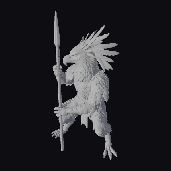 The feathered warrior stands poised, its body a mesmerizing blend of avian and humanoid features. The teal feathers on its body glisten with a subtle sheen, gradating to darker hues on its wings and tail. Its sharp, hooked beak and piercing red eyes exude a fierce intelligence. Clad in a mix of feathered and metallic armor, the creature grasps a long spear with a sharp, leaf-like tip. Its claws, wrapped in strips of leather or metal, dig into the air as if ready to strike. This 3D model is perfect for use in games, animations, or virtual reality experiences where a mythical, powerful creature is needed. Its detailed textures and realistic pose make it an excellent choice for designers looking to add a touch of fantasy to their projects.