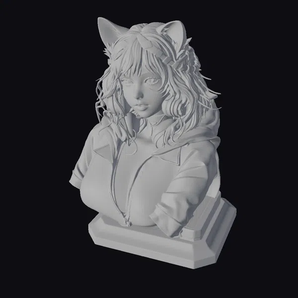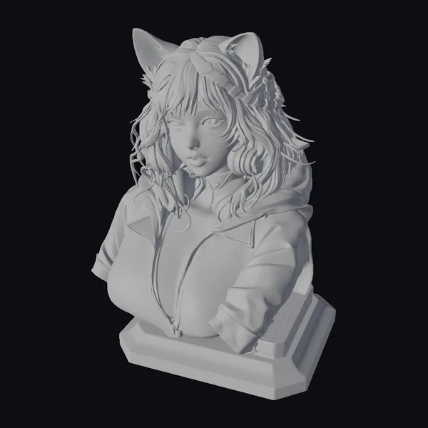 Positioned in a contemplative pose, this stylized bust showcases a woman with striking feline features, including cat ears emerging from her dark, wavy hair. Her hooded leather jacket appears to be illuminated by a subtle, unseen light source, accentuating the textures of the material and the smooth, pale skin of her chest. The detailed rendering of her facial features, with emphasis on her expressive eyes and lips, invites viewers into a world of dark fantasy. The bust’s base adds stability to this intriguing piece, making it suitable for various applications in games, 3D printing, VR/AR experiences, animation, and design projects.