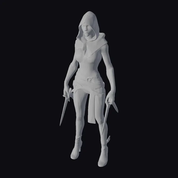 In a dynamic stance, this female assassin model is captured with her body angled slightly to one side, suggesting movement and readiness for action. Her attire is a blend of functionality and dark elegance, featuring a hooded top, gloves, and boots made of what appears to be a combination of leather and armored pieces. A brown sash wraps around her waist, adding a touch of contrast to her predominantly dark ensemble. The model is equipped with two blades, one in each hand, their sharp tips gleaming and ready for use. The texture of her skin and clothing is detailed, with subtle hints of a tattoo on her arm, adding to her character depth. The quality of the model suggests it would be suitable for high-end projects such as game development, animation, or detailed 3D rendering. Its stylized yet realistic approach makes it versatile for various applications, from cinematic productions to video game environments.