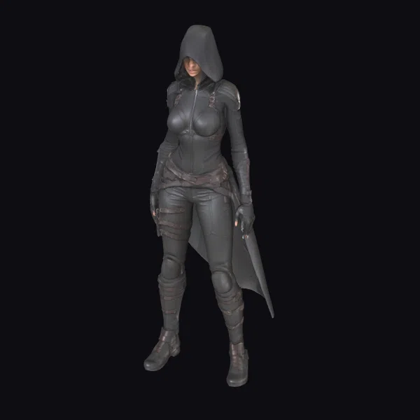 In a powerful, cinematic stance, this female assassin showcases her lean, muscular physique clad in a high-collared, long-sleeved black leather outfit. A hood casts her face in shadow, adding to her enigmatic presence. The outfit features detailed armor pieces on the shoulders and knees, complemented by a utility belt and a large sword sheathed at her side. The model’s textures exhibit a high level of detail, with visible stitching and folds in the leather, enhancing the realistic appearance. The pose, with one leg slightly forward and the sword hanging by her side, captures a moment of readiness and tension. This model is perfect for projects requiring a character with a blend of elegance and lethality, suitable for games, animation, VR/AR experiences, and design projects.
