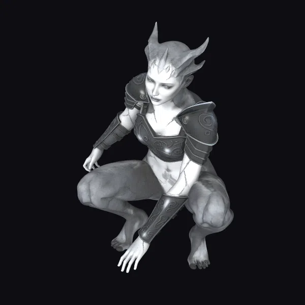This stunning female gargoyle is captured in a dynamic pose, crouching on a gothic rooftop cornice as if poised to leap into action. Her body, a blend of human and stone-like textures, showcases a mesmerizing interplay of light and shadow. The armor, intricately designed with swirling patterns, adds to her formidable presence. The moon casts a dramatic glow on her face, highlighting her sharp cheekbones, pointed ears, and intense gaze. Her horned headpiece and bare feet contrast with the armor, suggesting a blend of vulnerability and strength. This model is perfect for projects requiring a mythical, dark fantasy element, such as games, animations, or architectural visualizations. Its detailed features and realistic textures make it an excellent choice for high-quality productions.