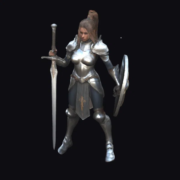 This meticulously crafted 3D model of a female knight showcases a powerful and elegant warrior, poised with a sword in her right hand and a shield in her left. Her silver armor, adorned with subtle gold accents, reflects light and seems to shimmer with a life of its own. The knight’s muscular legs are positioned in a dynamic stance, suggesting movement and readiness for battle. Her facial expression is one of focused resolve, adding to her commanding presence. The model is rich in detail, from the texture of the armor to the flow of her hair tied in a ponytail. This character model is perfect for use in games, animations, virtual reality experiences, or as a design reference.
