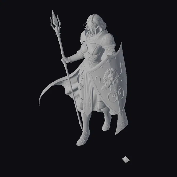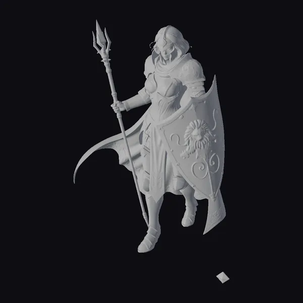 Rendered in exquisite detail, this female knight exudes confidence and strength, her long white hair flowing from beneath her helmet. Her dark grey armor is adorned with gold accents, complemented by a vibrant red cape flowing behind her. The lion shield she holds is a masterpiece of craftsmanship, with intricate gold designs and a regal lion’s head emblazoned on its surface. The trident in her hand adds a touch of mystique to her already imposing presence. Ideal for use in games, 3D printing, VR/AR experiences, animation, and design projects, this model is sure to make a statement. The level of detail, from the texture of the armor to the expression on her face, is meticulously crafted to transport viewers to a world of fantasy and adventure.