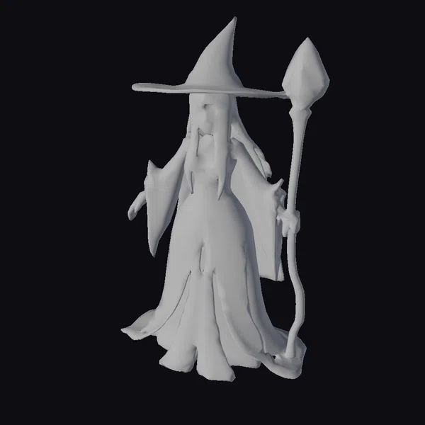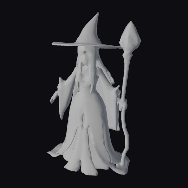 Detailed from head to toe, this 3D model of a female mage showcases a symmetrical mesh ideal for easy rigging and animation. Her neutral A-pose stance offers a versatile base for various scenes. The model features a pointed hat and a staff, complementing her gray robe with orange accents and a deep, mysterious yellow hair that cascades down her back. The clean edge loops and mirrored topology ensure a high-quality model suitable for games, print media, VR/AR experiences, animation, and design projects. The intricate details, from the texture of her robe to the expression on her face, invite users to explore the depths of fantasy.