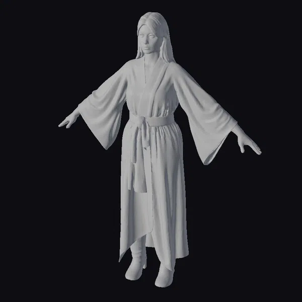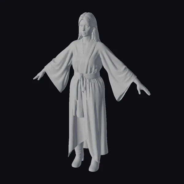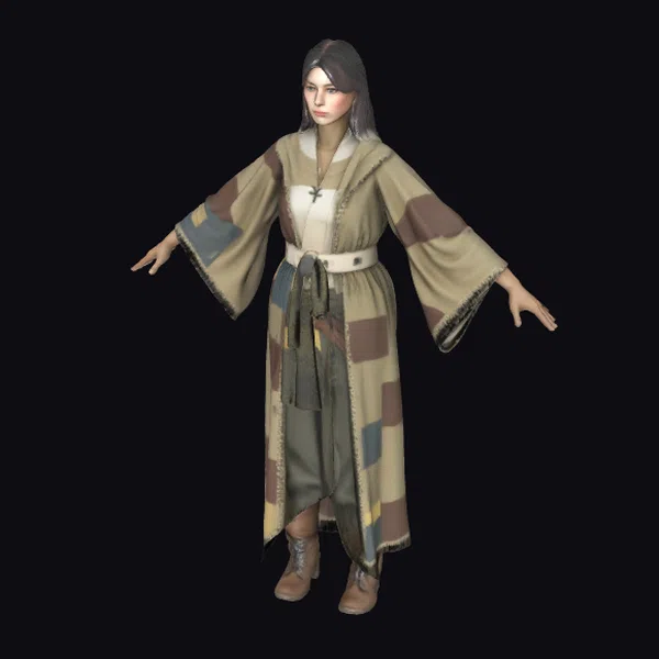 Standing tall with her arms outstretched in a T-pose, this realistic female wanderer character is meticulously detailed, from the patches on her cloak to the texture of her boots. Her outfit consists of a long, patchwork cloak over a white top and green pants, complemented by a scarf around her neck and a cross hanging from her neck. The cloak’s earthy tones of brown, beige, and blue patches give her a rustic appearance, suitable for a wanderer. The full PBR textures add a layer of realism, making her suitable for various applications such as game development, 3D printing, VR/AR experiences, and animation. The character’s design strikes a balance between functionality and style, making her a versatile asset for projects requiring a character with a sense of adventure.