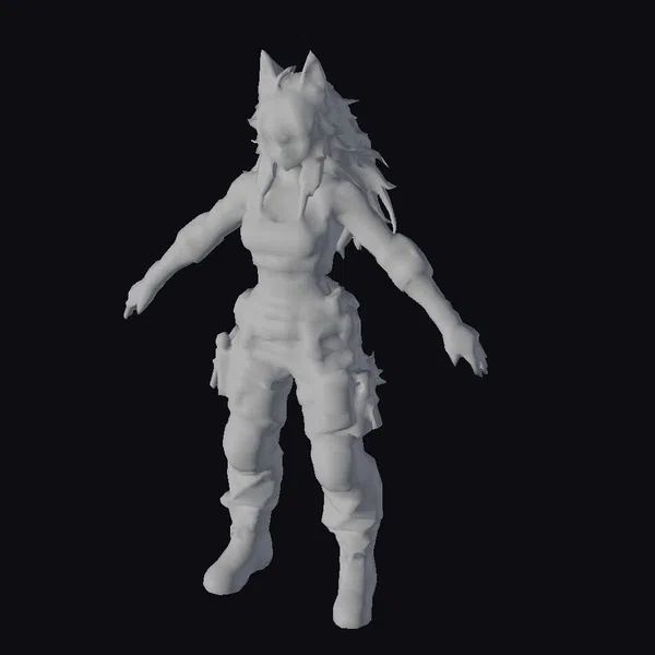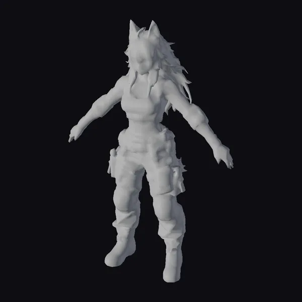Detailed with precision, this 3D model showcases a female warrior in a dynamic pose, her body angled slightly forward with arms outstretched. Her long, flowing black hair cascades down her back, complemented by the wolf-like ears that add a fantastical element to her appearance. The outfit is a marvel of design, with each piece meticulously crafted: from the arm guards that cover her forearms to the tactical pants adorned with utility pouches, every detail speaks to a character prepared for battle. The cropped top reveals her toned midriff, adding to the overall aura of strength and resilience. This model is ideal for use in video games, animation projects, virtual reality experiences, and any design work that requires a character with a strong, dark aesthetic.