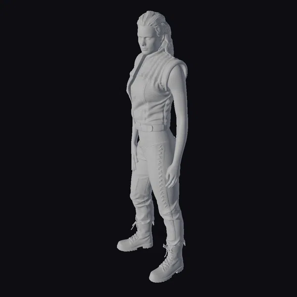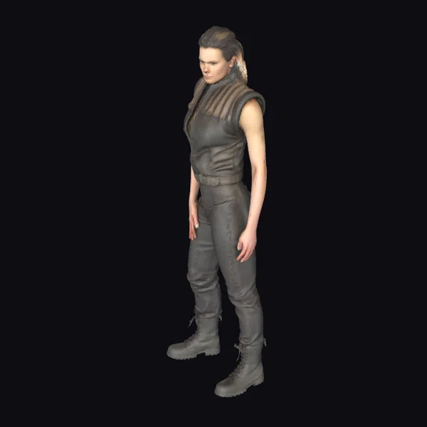 Detailed with precision, this 3D model showcases a female warrior in a powerful stance, her body angled slightly forward with hands by her sides. Her dark leather armor, complete with a high-collared top and shoulder guard, covers her torso, while her matching pants and boots provide a cohesive, battle-ready appearance. The model’s facial features are chiseled, with a focused expression that speaks to her unyielding spirit. The texture of the leather and the subtle play of light on her armor add depth to the model, making it suitable for a variety of applications, from game development and animation to architectural visualization and design projects.