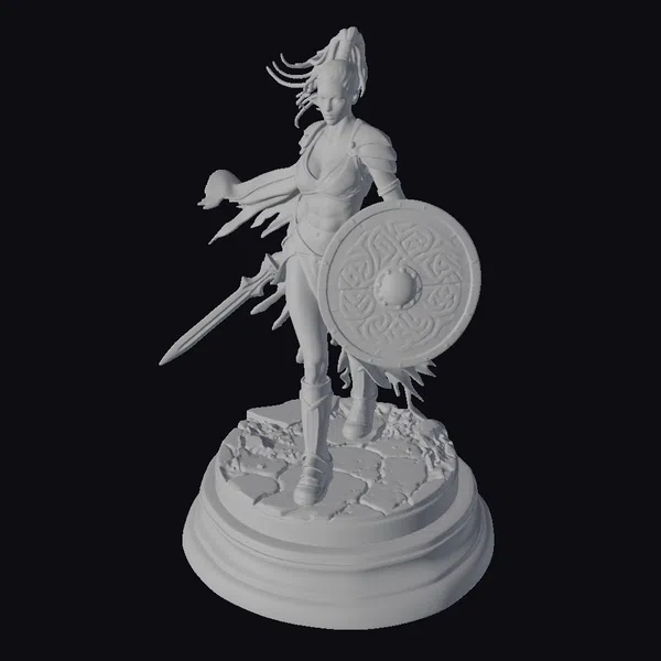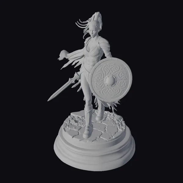 Detailed from her muscular physique to the intricate Celtic patterns on her shield and armor, this female warrior figurine is a masterpiece of realistic art. Her hair flows in the wind as she stands on a rocky terrain, sword in one hand and shield in the other, ready for battle. The shield features a striking design with gold and silver accents on a dark background, complementing her silver armor and red cape. This model is perfect for games, animation, or as a decorative piece, offering a blend of fantasy and historical elements.
