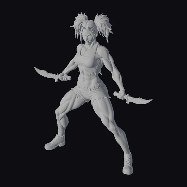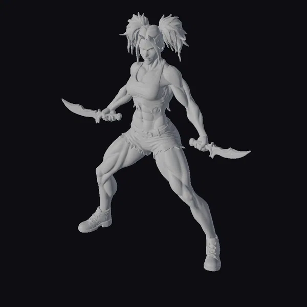 Standing in a powerful stance, this stylized female warrior exudes confidence and strength. Her dark hair is pulled back into two ponytails, and her eyes are fixed intently on the horizon. The ripped camouflage top and shorts reveal her toned physique, while her brown boots and belt add a touch of rugged practicality. The dual swords she wields are poised for action, their sharp blades glinting in the light. This 3D model would be perfect for use in games, animation, or design projects where a strong, capable female character is needed.