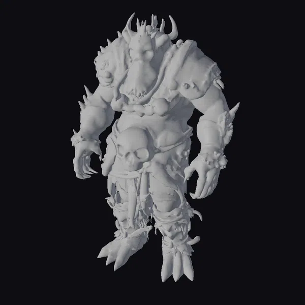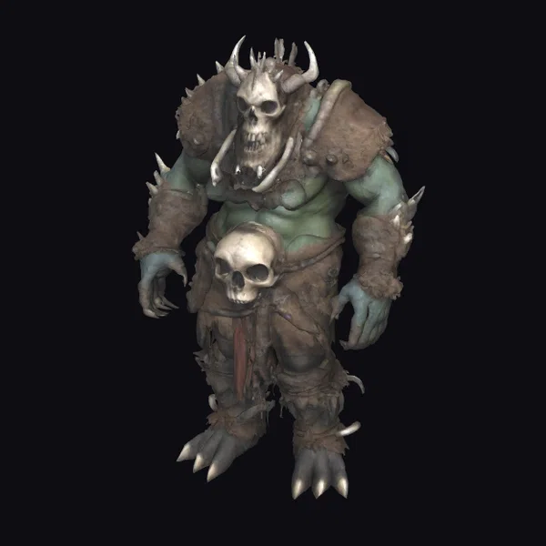 Standing tall with a muscular build, this feral creature’s green skin glistens under the faint light. Its tribal outfit, a mix of fur and spiked armor, tells a story of a primitive, survivalist lifestyle. Two skulls, one on its chest and another forming a mask, add to its intimidating appearance. The creature’s sharp claws and rugged texture evoke a sense of raw power. Ideal for projects requiring a fearsome, realistic creature, such as games, animations, or designs seeking a dark fantasy element.