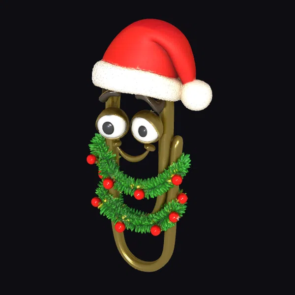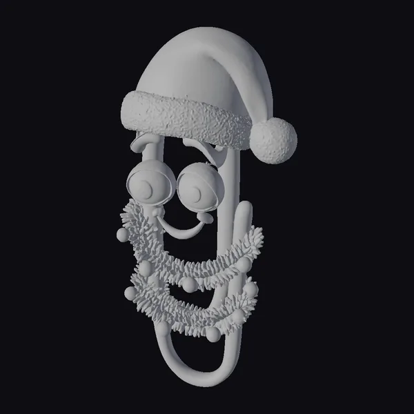 This delightful paperclip character is meticulously detailed, from the soft, fluffy trim on its Santa hat to the textured, shiny surface of its metallic body. The garland wrapped around its middle adds a pop of color and a festive touch, perfectly capturing the spirit of the holiday season. The paperclip’s cheerful expression, complete with large, expressive eyes and a curved smile, invites joy and positivity. Ideal for adding a whimsical touch to holiday-themed projects, games, animations, or as a unique decorative element in design work.
