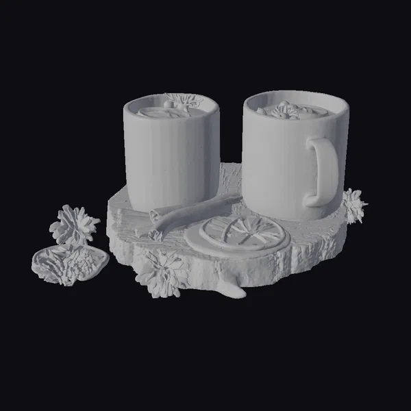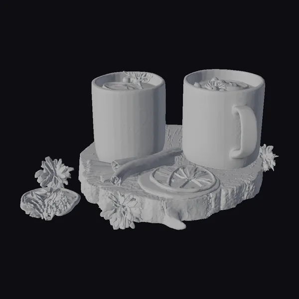 Nestled on a natural wooden platter, these two radiant red mugs, boasting intricate white patterns reminiscent of winter’s gentle kiss, seem to emanate warmth. Each mug cradles a steaming beverage, garnished with what appears to be lime, herbs, and cranberries, inviting a sip of the season’s magic. The platter, adorned with cinnamon sticks, dried orange slices, and a few strategically placed flowers, tells a story of cozy gatherings and heartfelt conversations. The detailed textures of the mugs, the rough bark of the platter, and the delicate patterns on the flowers all contribute to a scene that is as inviting as it is visually stunning. Ideal for those looking to add a touch of holiday warmth to their 3D projects, be it for animation, games, or virtual reality experiences.