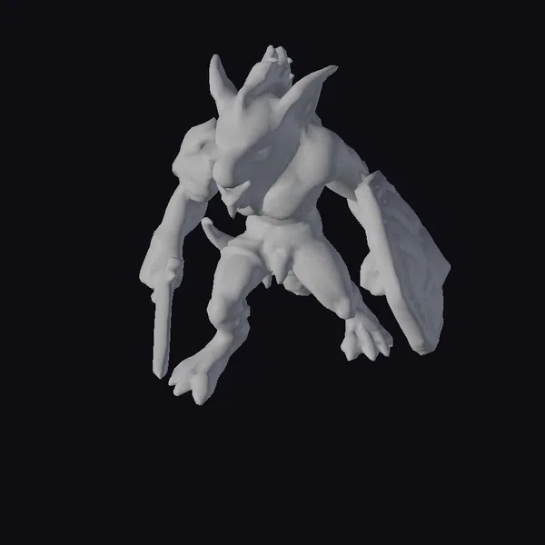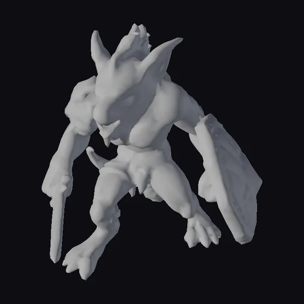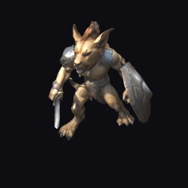 Positioned in a powerful crouch, this creature’s feline body is complemented by canine features, including its snout and ears, exuding a sense of raw power. The armor covering its shoulders and arms adds to its intimidating appearance, while the sword in its hand suggests readiness for battle. The texture of its fur and the detailing on the armor and weapon highlight the model’s high level of detail. Ideal for use in fantasy games, animations, or designs requiring a mythical creature with a strong presence.