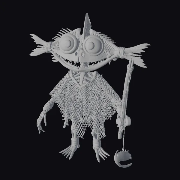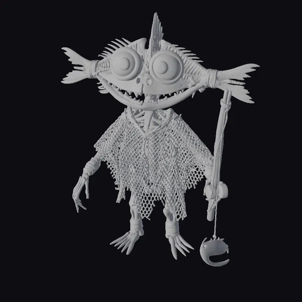 Detailed visual breakdown reveals a creature with a bulbous, fish-like head, complete with large, expressive eyes and a wide, toothy grin. The body is humanoid, wrapped in a mesh fishing net and twine, with a fishing net draped over its shoulders. A fishing line and hook hang from its hand, suggesting a life spent by the sea. This character’s unique blend of fish and human features makes it perfect for games, animation, or design projects seeking a touch of whimsy. Its stylized appearance ensures it stands out in any scene.