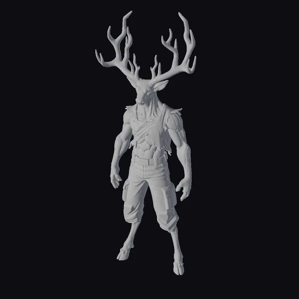 Standing tall with a powerful physique, this humanoid’s upper body is defined by ripped, off-white clothing that reveals its muscular torso. Its lower body is clad in beige cargo pants, rolled up to reveal sharp, hoof-like feet. The focal point is its head, a blend of deer and human features, crowned with large, flame-licked antlers that radiate vibrant orange and yellow hues. The overall effect is one of raw power and mystique, perfect for projects requiring a touch of the extraordinary. Ideal for use in games, animations, or designs seeking a fantastical element.
