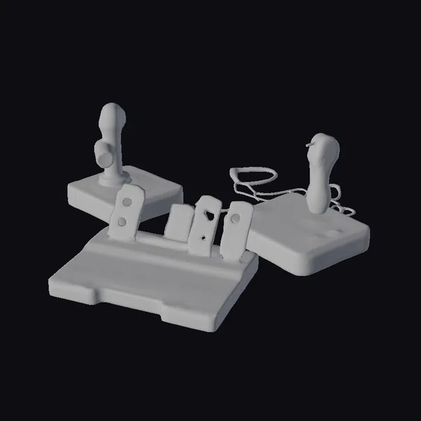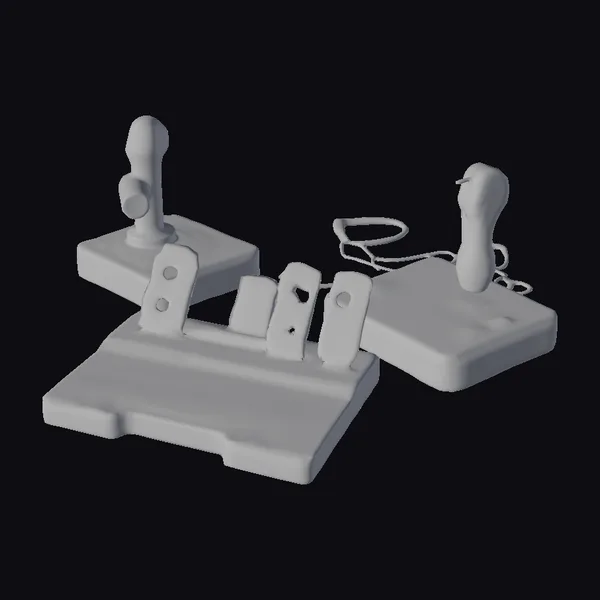 In meticulous detail, the flight simulator controls reveal a complex array of features. The two joysticks, positioned on either side, showcase a sturdy construction with textured grips and prominent red buttons. The central panel, slightly elevated, houses three metallic foot pedals with a ribbed surface, while a multitude of buttons and switches adorn the surface. A wiring harness snakes between the components, adding to the sense of realism. These controls are perfect for game developers, simulation enthusiasts, and aviation professionals looking to create immersive experiences. Whether for gaming, training, or simulation purposes, this model offers a wealth of creative possibilities.