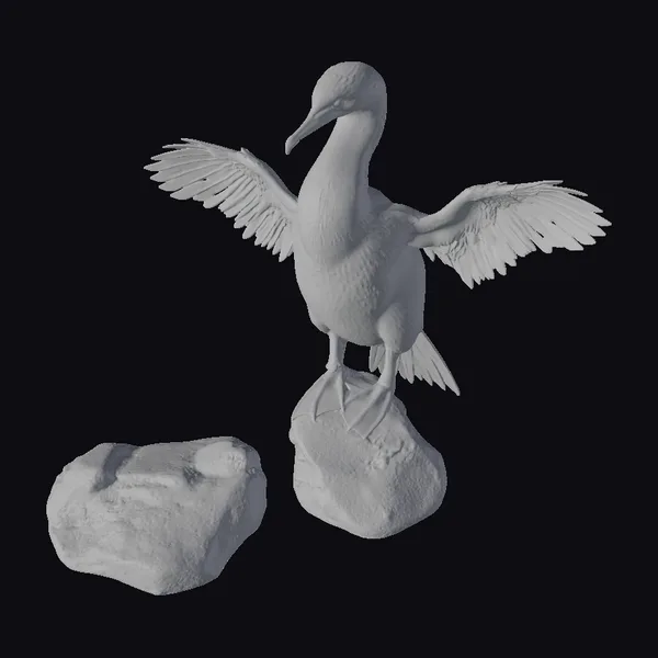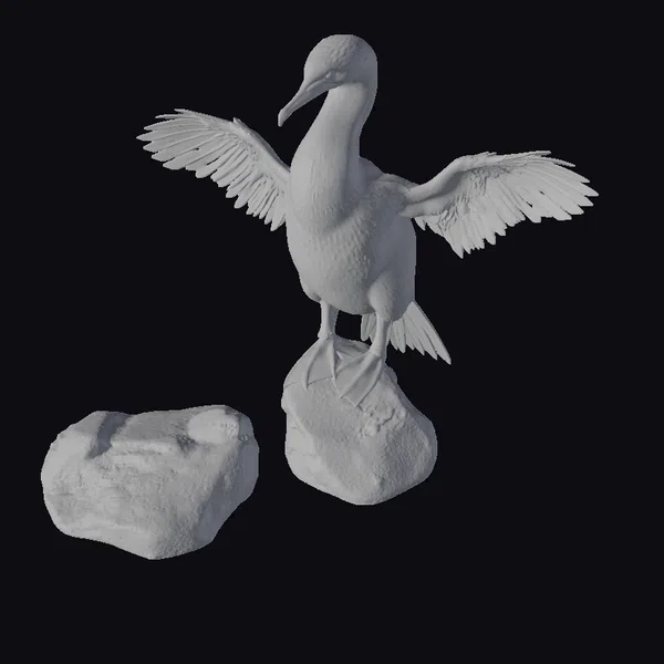 In a striking pose, the cormorant stands atop a weathered rock, its wings outstretched to reveal the full span of its feathers. The bird’s plumage is meticulously detailed, with varying shades of brown and gray that catch the light, suggesting a subtle sheen. The rock beneath it is equally detailed, with textures that invite the eye to explore. This 3D model is perfect for projects requiring a realistic wildlife element, such as animations, games, or architectural visualizations. Its realistic style ensures it will integrate seamlessly into any environment, from natural landscapes to more stylized settings.