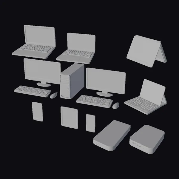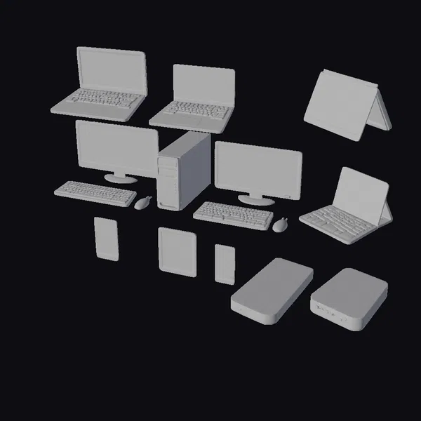 In a stunning visual display, a wide range of computer devices appears to be floating against a pristine white backdrop. The collection includes multiple laptops in various orientations, some with their keyboards facing upwards, while others are positioned with their screens propped open. Several tablets and smartphones are scattered throughout, adding to the assortment. A pair of desktop monitors sit atop sleek keyboards, accompanied by mice, and a central desktop computer tower anchors the arrangement. The devices’ blue screens glow uniformly, drawing attention to their crisp lines and contemporary design. This comprehensive set of computer devices is perfect for projects requiring a modern technological theme, suitable for applications in games, 3D printing, VR/AR experiences, animations, and design visualizations.