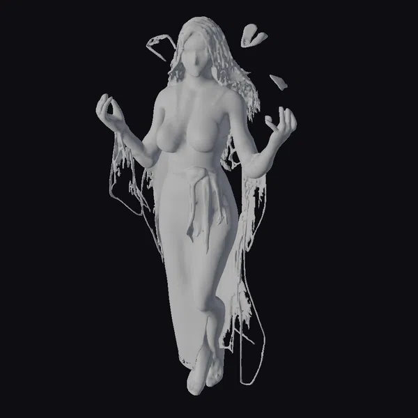 This captivating figure of a forest ghost showcases a slender, graceful female form floating effortlessly in the air. Her long, flowing hair cascades down her back as she extends her delicate hands, palms up, inviting the viewer. A transparent, flowing robe drapes elegantly around her body, adorned with vibrant flowers that seem to bloom across her skin as well. The ghost’s pale complexion glows softly, complemented by the delicate features of her face and the serene expression. Surrounding her, butterflies flutter, adding to the dreamy, ethereal atmosphere. This model is perfect for projects requiring a mystical, enchanting character, suitable for use in games, animations, VR/AR experiences, and design projects.