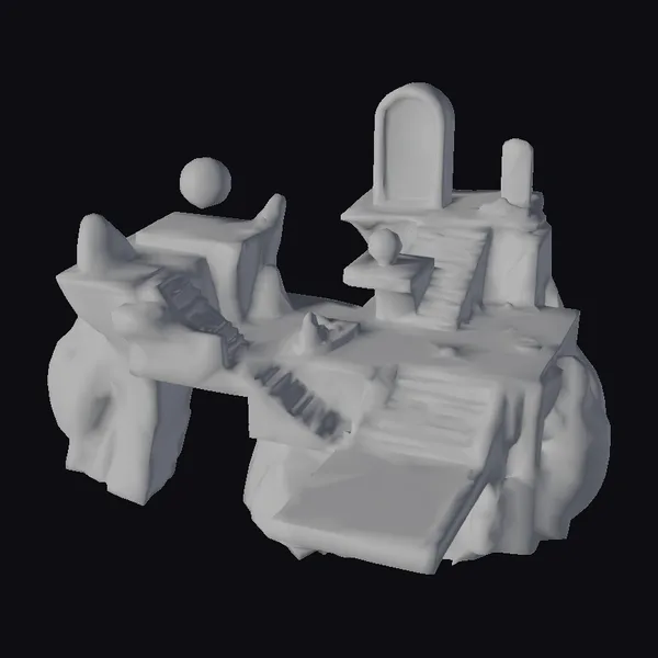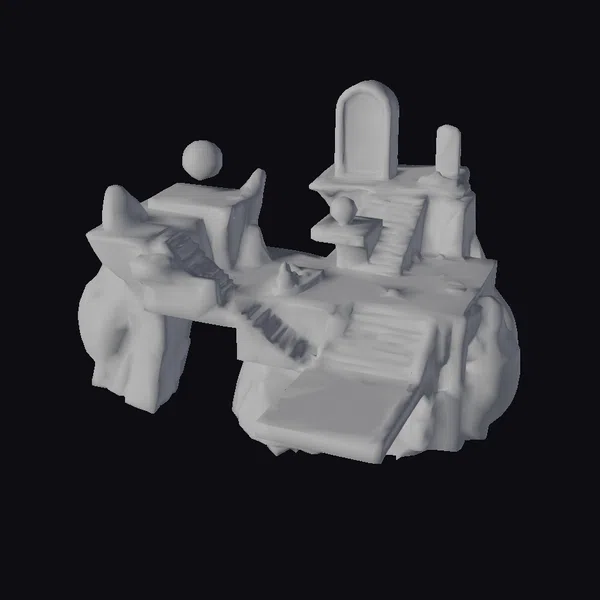 Suspended in mid-air, this fantastical platform structure boasts a complex arrangement of gray, rock-like formations, each one seemingly defying gravity. The platforms are interconnected by a series of colorful, metallic staircases that shimmer under the light. Glowing orbs in shades of purple, blue, and green add a pop of color and energy to the scene, while the central archway emits a warm, pinkish glow. The intricate details and textures of the model invite exploration from every angle, making it an ideal asset for game developers, architects, and designers seeking to create immersive, otherworldly environments. Whether for a sci-fi game, virtual reality experience, or architectural visualization, this model brings a unique blend of fantasy and futurism.