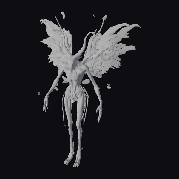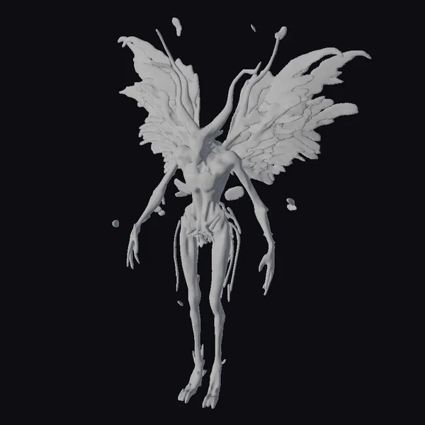 In a pose that suggests dynamic movement, the floral chaos demon stands tall with its elongated legs and arms stretched out, as if caught in the midst of a wild dance. The creature’s body is a blend of humanoid and feral features, covered in a texture that mimics the roughness of tree bark and the softness of petals. Its wings, a vibrant mix of purple, pink, yellow, and green, are spread wide, with each petal-like protrusion delicately detailed. The lighting accentuates the creature’s form, highlighting the contrast between its wild, chaotic appearance and the serene beauty of its floral wings. This 3D model is perfect for projects that require a mythical, fantasy creature, such as animations, games, or virtual reality experiences.