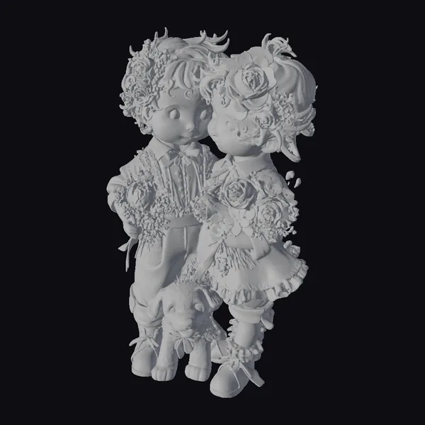 This captivating scene features two children and a puppy, meticulously detailed with a stylized flair. The children, adorned with flowers in their hair and holding bouquets, display a tender moment of affection. The puppy, with its soft fur and pink bow, adds to the heartwarming atmosphere. The characters’ pastel-colored clothing and accessories, including lace and ribbons, enhance the whimsical feel. This model is perfect for use in games, animations, or 3D printing, offering a delightful and imaginative visual treat.